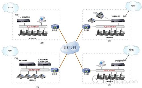 潮流網(wǎng)絡(luò)提供整套端到端的 IP 網(wǎng)絡(luò)產(chǎn)品,UCM6100 IPPBX 系列產(chǎn)品將整個(gè)語(yǔ)音、視頻、移動(dòng)通訊整合起來(lái),并能夠兼顧到原有的布線架構(gòu)和模擬設(shè)備的投資,方便業(yè)務(wù)的擴(kuò)展,完美的將總行和分行之間的通訊融合起來(lái),充分的保護(hù)原有的專網(wǎng)設(shè)備投資,提高了銀行內(nèi)部員工的工作效率。